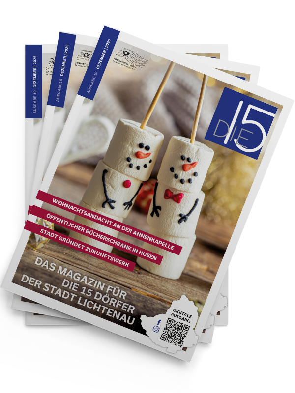 Das Stadtmagazin DIE15 ist ein Angebot der Marketinggemeinschaft Lichtenau und wird von der Deutschen Post im gesamten Stadtgebiet 1x pro Monat verteilt.